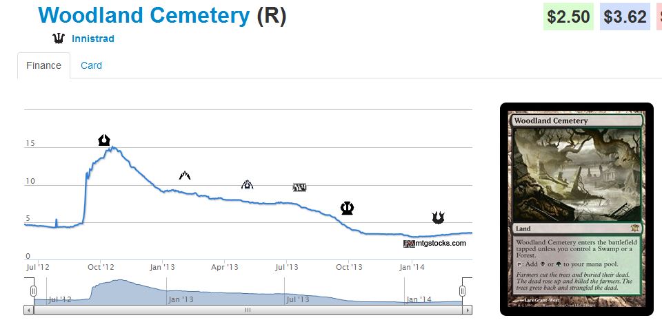 Notice how the price of the Innistrad duals increase by 2x-3x once Standard rotated. Even with shocklands entering the format, the mana-fixing duals from Innistrad spiked handily.