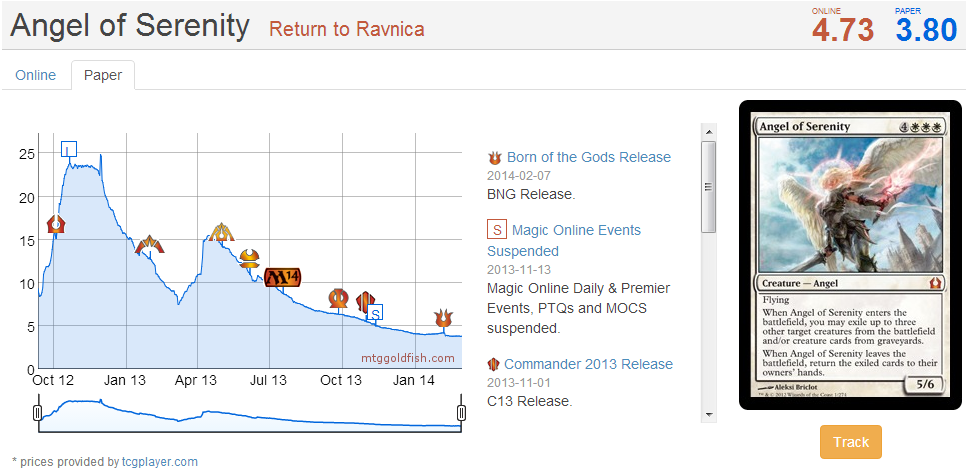 Here’s a card that peaked at $30, albeit from Standard demand during Junk Rites’s heyday. However, this card has a lot going for it. It’s an angel, which is well-known as one of the most popular casual tribes. It’ a mythic, and thus in short supply relative to other cards from the set, assisted even more by the fact that Return to Ravnica wasn’t opened as frequently as other recent fall sets (at least as far as drafts go).