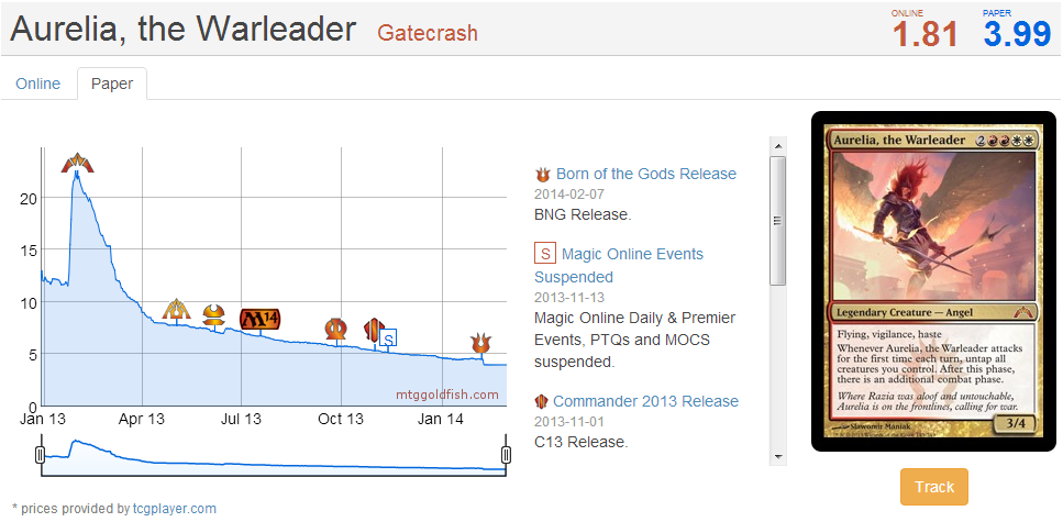 Aurelia’s appeal is more limited than Angel of Serenity’s, given its more restrictive colors and the likelihood that it probably isn’t quite good enough for Cube. Still, it’s one of the premier choices for a red-white Commander deck. There’s no way Gatecrash sold as much as Return to Ravnica, so it’s also in shorter supply.