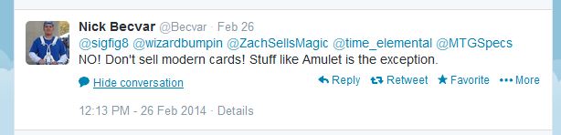 I think for Wizards to keep deck costs under control they will at some point in the distant future be forced to introduce a more modern Modern format, let’s say perhaps from RTR forward. If that format becomes too expensive they might start from whatever set they release in 2020 forward, etc. I doubt much can be done based on this today, but, I would certainly like Sig’s suggesting expect Modern to behave a lot like Legacy.