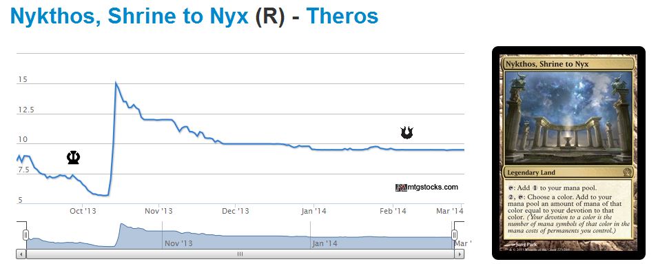 My traditional speculation strategy would suggest I sell out of Modern come this summer, during the middle of PTQ season, and begin investing in the floundering Standard format. Standard staples like Nykthos, Shrine to Nyx are bottoming out now, but are poised to drive higher once Return to Ravnica block rotates out of Standard.