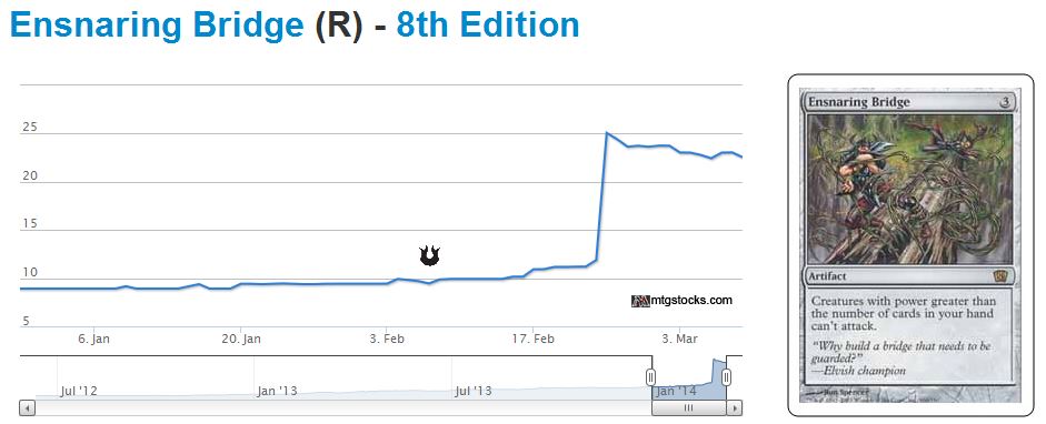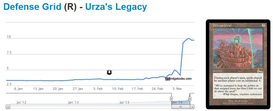 This card was also printed in three different sets, and very similar sets for that matter. It’s also an artifact that saw some play in sideboards at the Pro Tour. For some reason, Defense Grid was not readily noticed like Ensnaring Bridge. Notice how the card spiked about a week later.