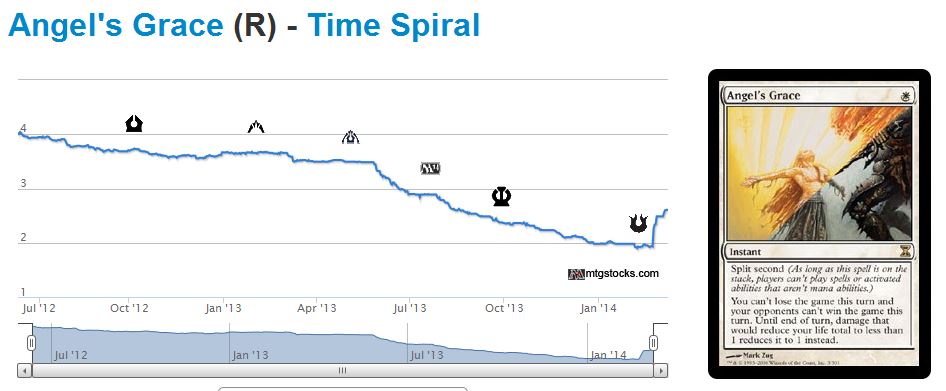 The card was reprinted in Modern Masters, but so what? Cryptic Command was reprinted at rare, too. And Time Spiral is an awfully old set relative to Shards of Alara. As a four-of in the Modern list (along with fringe Legacy playability) I can see Angel's Grace moving higher.