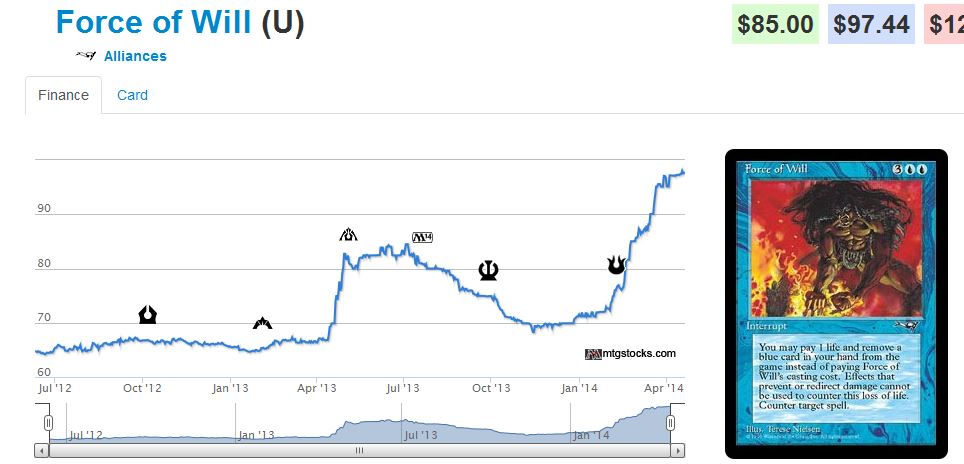 A great example right now would be Legacy staples. These are all skyrocketing in price: Force of Will, Wasteland and duals are all hitting record highs.