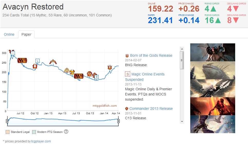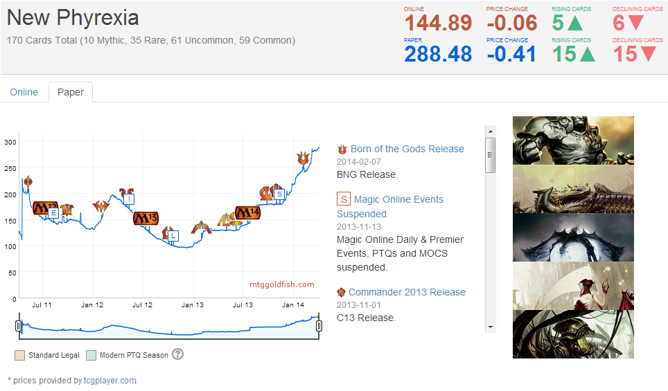 Each of these sets declined the summer following release, spiked at the release of the following fall set, then reached their floors the next summer, close to rotation. However, after a couple years, both sets have climbed back toward preorder levels, with New Phyrexia even surpassing them. This is due the high number of eternal-playable cards in NPH, but AVR shows us that casual cards can hold their own, too.