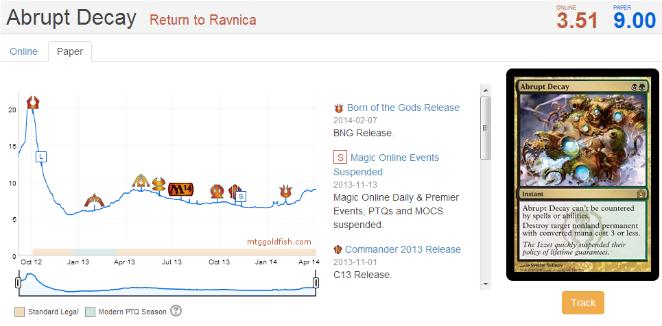 11. I want this article to go up to eleven, so Iâll close by reiterating that prices are hyped right now. Abrupt Decay was immediately identified as a Legacy-, Modern-, and Standard-playable card, and that has panned out almost to the extent that hype dictated. Preorders reached as high as $20 for this fall-set rare, and youâd think that would seem reasonable given that the cardâs pedigree has really panned out. And yet, Abrupt Decay was available within a month of its release at half its preorder price, and fell all the way to $5 two months after its release. Keep that in mind this preorder season.