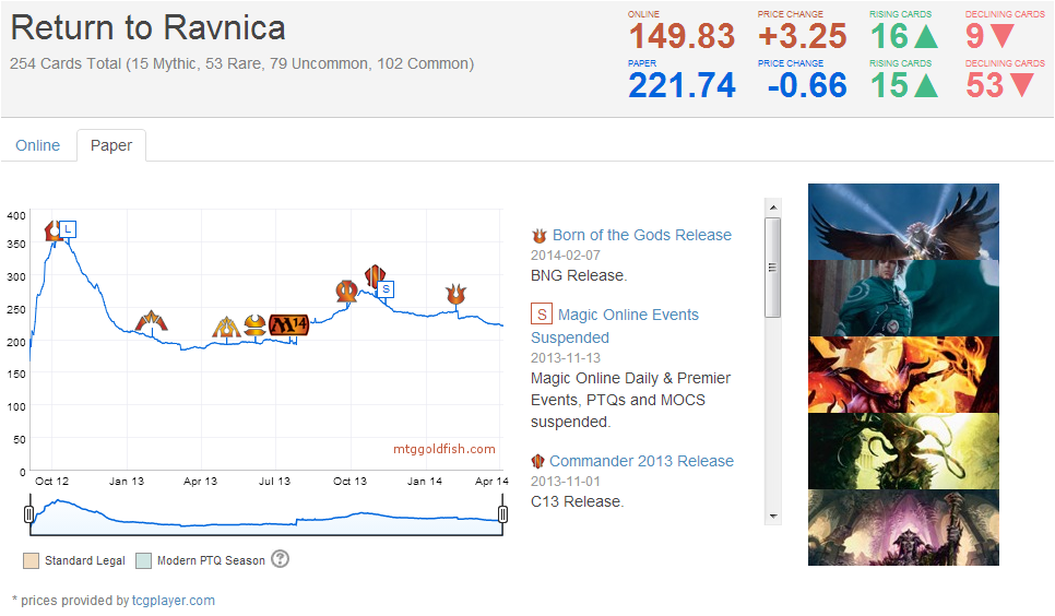 To illustrate this, check out the below graphs tracking the prices for the rares and mythics in each of the sets from last yearâs block.