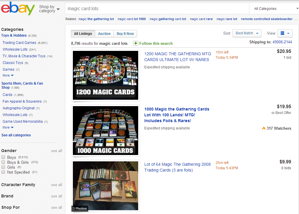 This guy has a formula that seems to work. He's charging $8 for shipping on top of the listing price, which should make him a little extra money if he ships for cheaper. By weight, 1000 cards isn't going to cost that much to ship and there are flat-rate options available. Let's check out Amazon, too, and see if anyone there has something that works.