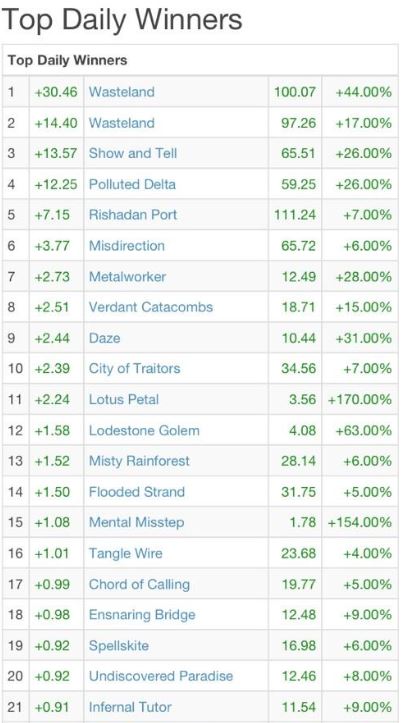 Wasteland jumped from 65 tix to 100 tix within the hour. Show and Tell, Sneak Attack, Rishadan Port, City of Traitors, Misdirection, Daze, Lotus Petal, Red Elemental Blast, Mental Misstep, Polluted Delta and other Eternal staples all jumped by 10-25% in a day.