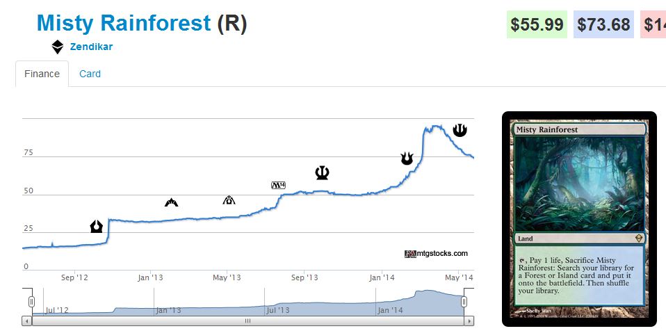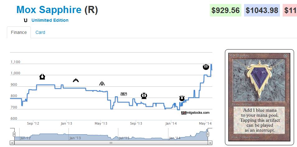 Many members on this site (and other sites) have discussed buylisting into multiple pieces of power. This was made possible by the huge increase in the ‘value’ of the secondary market over the past couple years when fetches went from $30 to $100. Many players jumped when they realized that they could sell one or two modern re-printable fetches and buy an ABUR dual. This triggered the rise in duals that we saw last month. At the same time, the more savvy investors were able to unload their fetches for moxes. It is crazy to think about, but you could have sold a playset of misties and tarns for ~$600 and bought a decent condition Mox. My theory is that whenever you have a market which grows in value significantly, as did the MTG secondary market thanks to the increase in the value of Modern cards, you’ll see a trickle-up effect where the expensive cards get more expensive.