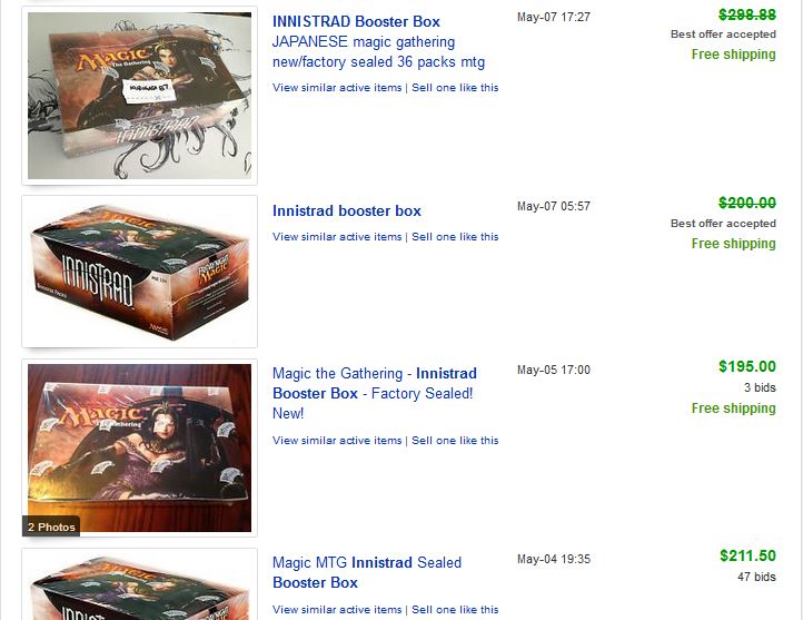 I believe the flaw in my logic here is that older boxes were all printed before Magic’s recent surge in popularity. Naturally older sets would be much rarer, meaning I had a lot less competition when selling. Also key cards from the above sets (well, maybe not Coldsnap… that was just a severely underprinted set) drove demand for Booster Boxes. And while there are plenty of key cards in Innistrad worth opening, the number of sellers of these is much greater and the set is much newer. These factors have made selling for sizable gains fiercely competitive.