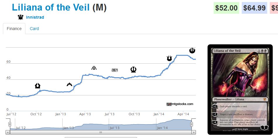 The price trajectory on Liliana of the Veil is even more impressive! A $20 investment could be netting you well over $50 now – a 200% gain! Foils have also jumped nicely.