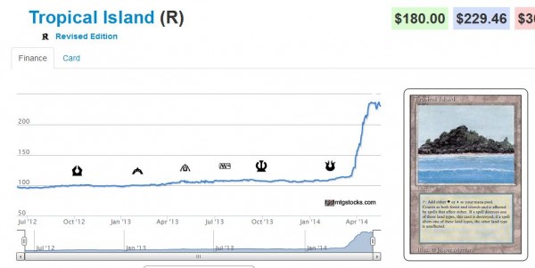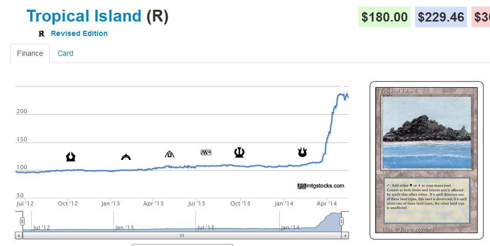 If I wasn’t sitting on Modern Masters Booster Boxes, I could have made a sizable purchase of Tropical Islands the week after Underground Sea and Volcanic Island spiked. This was one of the safest bets in recent MTG history, and any investment in $100 Trops would have netted significant gains. As it stands I managed to acquire a total of two copies before they spiked. I’m severely disappointed in this missed opportunity because guaranteed profit with minimal time horizon occurs less frequently than you’d think in MTG finance.