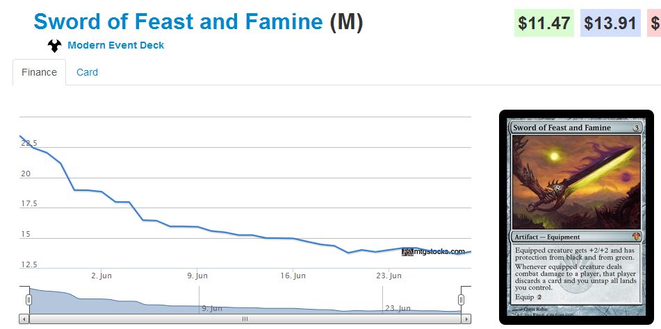 I’ve also decided to move all my Swords. You know, Sword of Feast and Famine and the rest of the cycle. Again, I know casuals love these and they have some Constructed playability as well. But after watching Sword of Feast and Famine get smashed by the Event Deck reprint, I was delighted to get $13ish for my played copy.