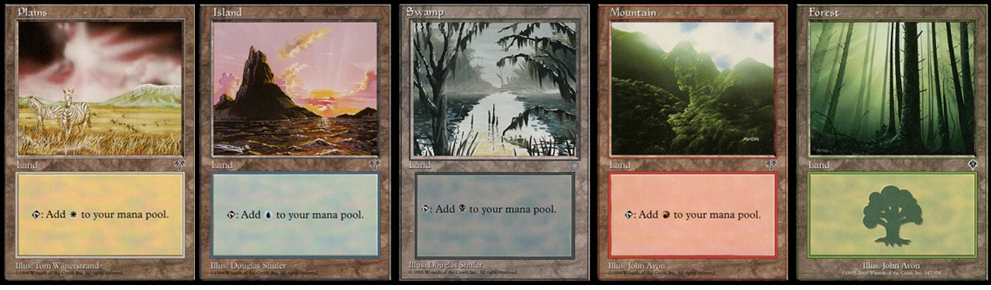 For my part, I am a firm believer in the original border. Besides Zendikar full-arts, I refuse to play with lands post-Eighth Edition. I also hate white-bordered cards, except for those from Revised—it's a nostalgia thing. The five basics I’ve been using since I started packing my own lands are shown below. Do you have a favorite set of basic lands?
