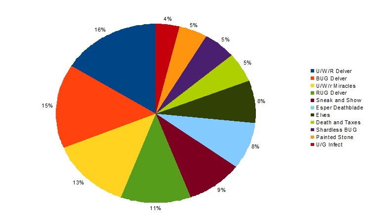 I love graphs. Â David took an intelligent approach to breaking down the Legacy metagame, and the end result looked like this:
