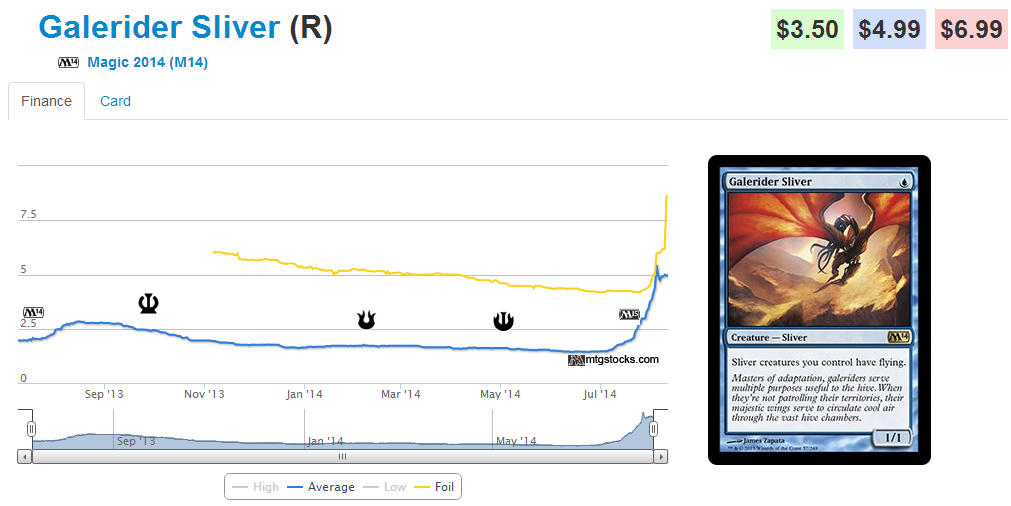 Why would it? Demand typically makes prices go up, not down. With slivers doing things in Standard and desired by casual players, it makes sense that the demand will make prices go up, and that means the foil Galerider is due for an upward price correction. That's the only thing that makes sense when the foil is the same price as the non-foil, right? Demand makes prices go up, and the foil is the only card that can go up.