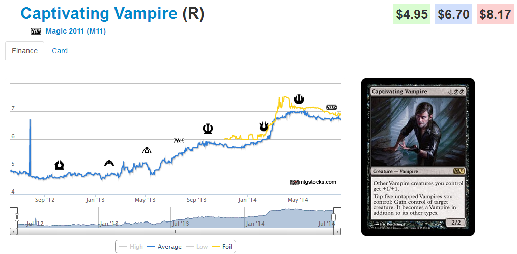 Simple! We look at a time before the card was talked about in Standard. That was the time before the non-foil spiked to $5. It was $2 right when it was new, and the modicum of Standard demand (one-of in one deck) made it maintain its M14 presale price. That in and of itself was quite a feat. For a casual card to maintain its presale price status is remarkable.