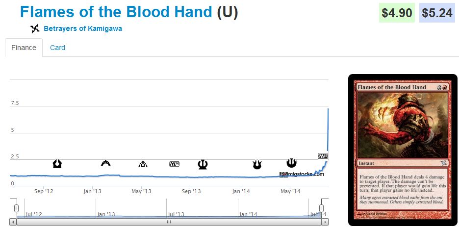 Sliver Overlord was suddenly scooped up thanks to the reappearance of Slivers in Magic 2015. Flames of the Blood Hand was suddenly bought up because of its recent success in mono red decks in Modern. The red sorcery isn’t as powerful as Skullcrack, but apparently life gain strategies in Modern are so prevalent that playing some Flames of the Blood Hand as “Skullcracks 5-8” is good enough. I guess that’s what happens when Kitchen Finks are everywhere and Soul Sisters is kind of a thing.