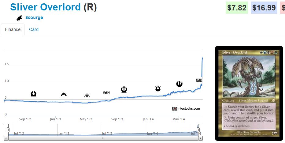 I almost had forgotten what these buyouts looked like. It had been so long! In fact, I’ll even admit there were days at a time when I didn’t check the Interests page on mtgstocks.com. Price movements had become so boring that the daily movements didn’t get me excited. As a result, the jump on Sliver Overlord completely skipped over my radar and I managed to acquire only one measly HP copy at the old price.