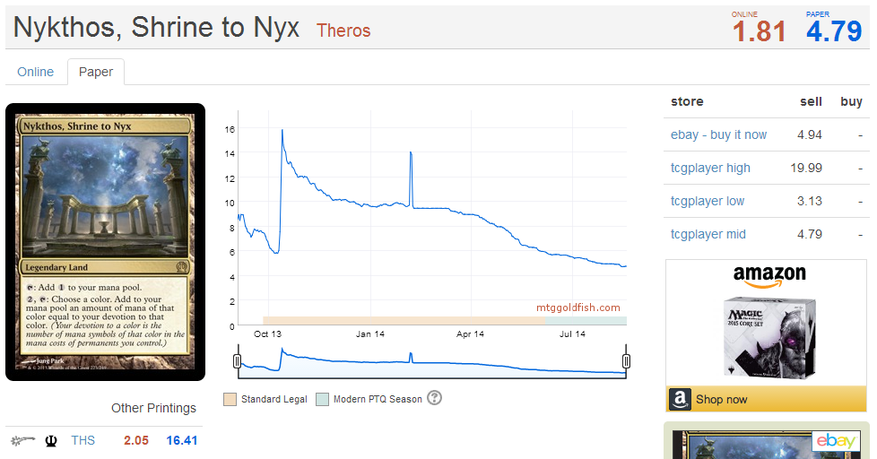 ...and this card is currently at its all-time low price. With Theros block no longer being drafted, supply isn't going to get any higher. Nykthos has been a powerhouse in Standard and has seen its share of testing in Modern, though without any real tournament success to back it up. This seems like a price floor to me, or at least darn close, and I doubt this card will ever be this low again, even after it rotates. My only concern is that this is (once again) a fall-set rare. Give it some thought.
