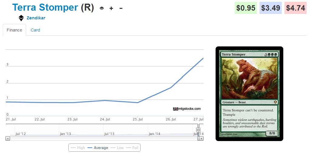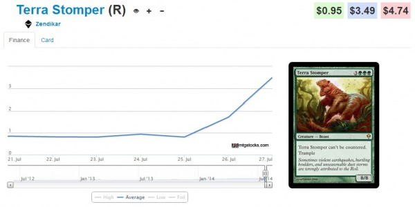 #1 Terra Stomper (+359.2%) - The reason for this guy being the biggest jumper for the penny stock group is that he was included in the green Sample Deck but not in normal M15 packs. However, many stores didn't realize this and in order to fill preorders they were forced to crack Sample Decks or buy up the Zendikar version. Thus his bump was mainly due to misunderstanding.