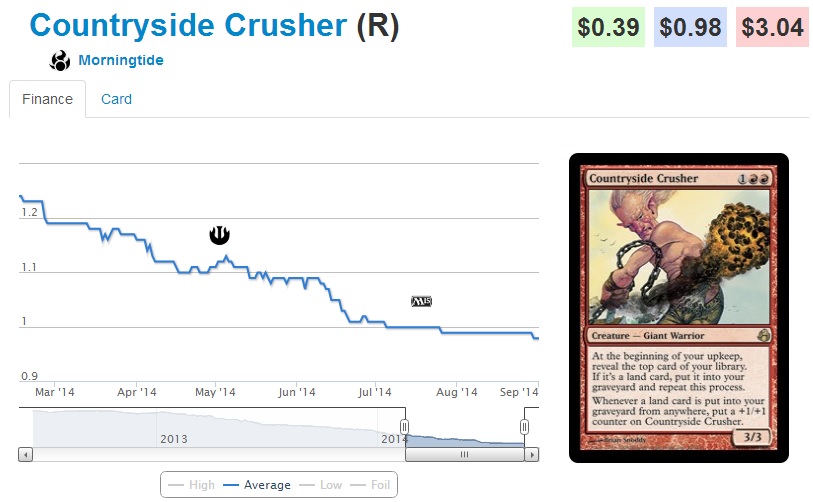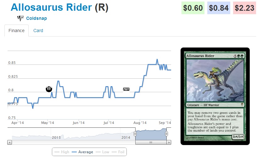 This time we see no gains and instead see a decline followed by a flatline. Part of this is likely due to the fact that M15 had just come out and we've seen time and time again that almost all “new” cards in the set start out more valuable then they end up a month later (due to the fact that the first few weeks of a sets release supply is still very limited and demand is at it's peak).