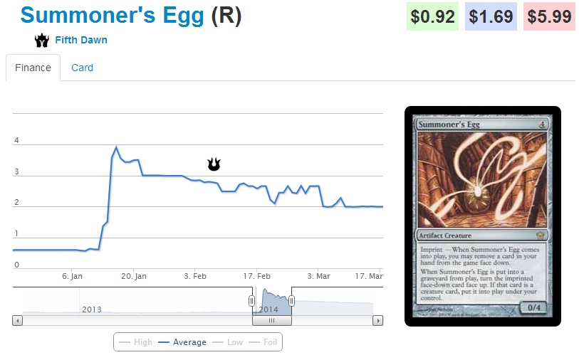 Our ninth example comes from this article, (http://www.channelfireball.com/articles/woo-brews-eggsploring-modern/), posted on January 13th, 2014. Summoner's Egg was a new and creative way to cheat in an Emrakul in a format that has a really hard time getting rid of him.