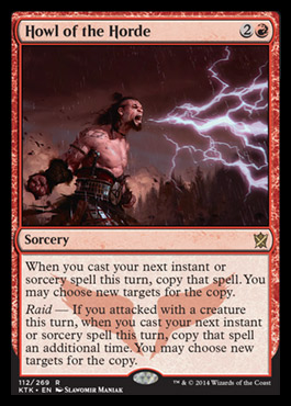 At worst, Howl of the Horde is a weak Fang Dragon // Forktail Sweep. At best, with raid triggered, it’s a double-Fang Dragon // Forktail Sweep, and thus, a source of card advantage that also carries the potential for generating massive tempo. It creates two extra spells for the price of copying one, which equates to drawing a spell and playing it for free. Red card advantage is nothing to take lightly, especially considering this card will most likely be copying burn spells. In a deck based around the Philosophy of Fire, Howl of the Horde is a unique and powerful option.