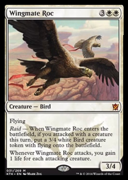 This card screams value. This card will be ideal at the top of an aggressive curve. In a deck with plenty of cheap ways to trigger raid, Wingmate Roc is comparable to a cheaper Broodmate Dragon. Putting two creatures into play for the price of one is card advantage and massive tempo, and I expect this card to bury opponents all Standard season.