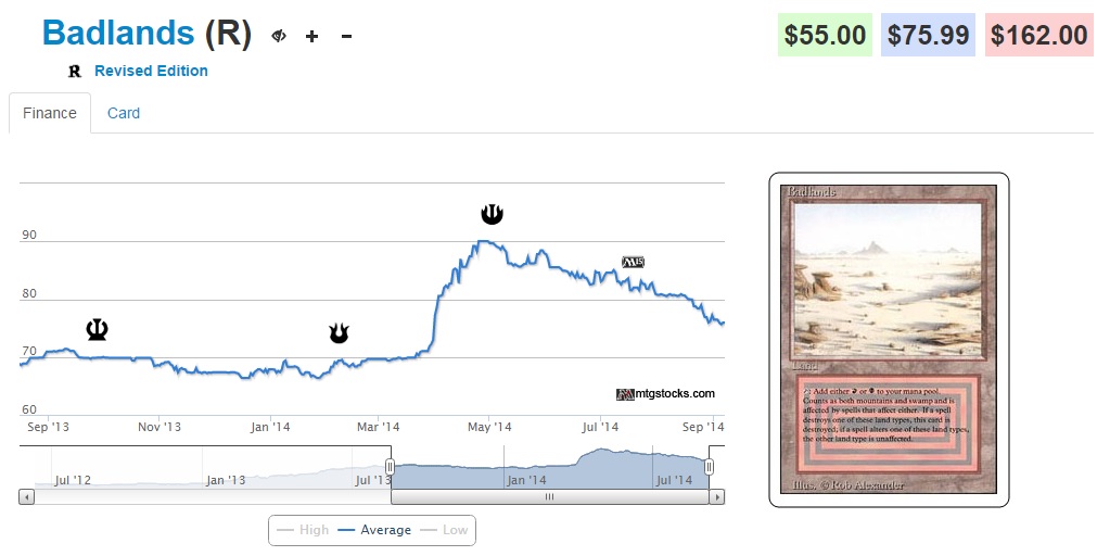 #3 Badlands (-3.17%) - Jund continues to fall into decline in the Legacy metagame and Zombardment hasn't really made a showing since its debut. Badlands continues to suffer from the over-price spike that occurred earlier in the year as demand is still limited and the color combination isn't that common in Legacy.