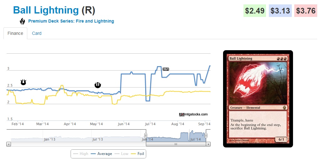 #4 Ball Lightning (Fire vs Lightning) (+19.5%) - This one is also a bit confusing; either the burn archetype has brought new players into Modern, who want to foil out their decks but don't want to pony up the extra 50 cents for an M10 foil version; or there's a glitch on MTG stocks with the price on this one. The large quantity of plateaus could be an indicator that a lot of them just aren't up for sale and/or aren't purchased so the price doesn't move much and when it does it adjusts the average enough to show movement on here.