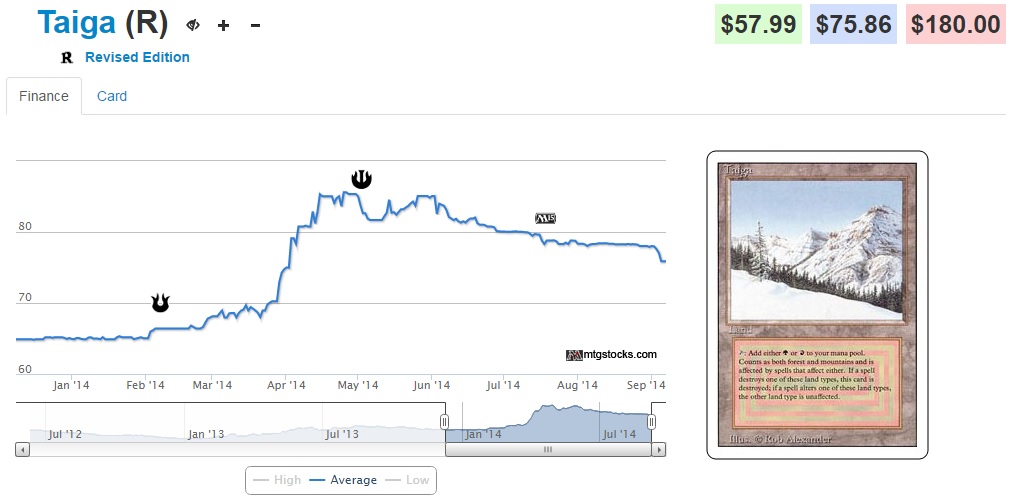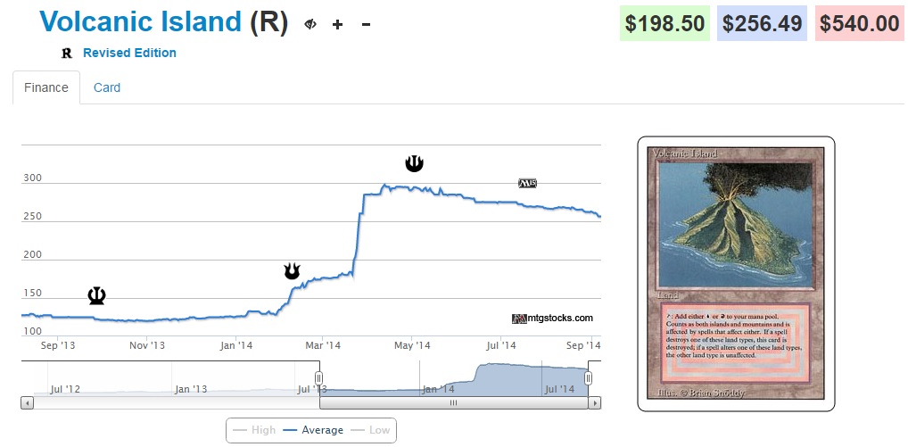 I’m surprised that you attribute falling duals prices to meta game performance and not as a response to the artificial price hike we saw earlier this year. I’m more under the impression that retail vendors saw low supply and sky rocketed prices to increase inventory with more aggressive buy list prices. This price hike was not as prevalent on ebay where the price of volcanic island still stayed around $200.