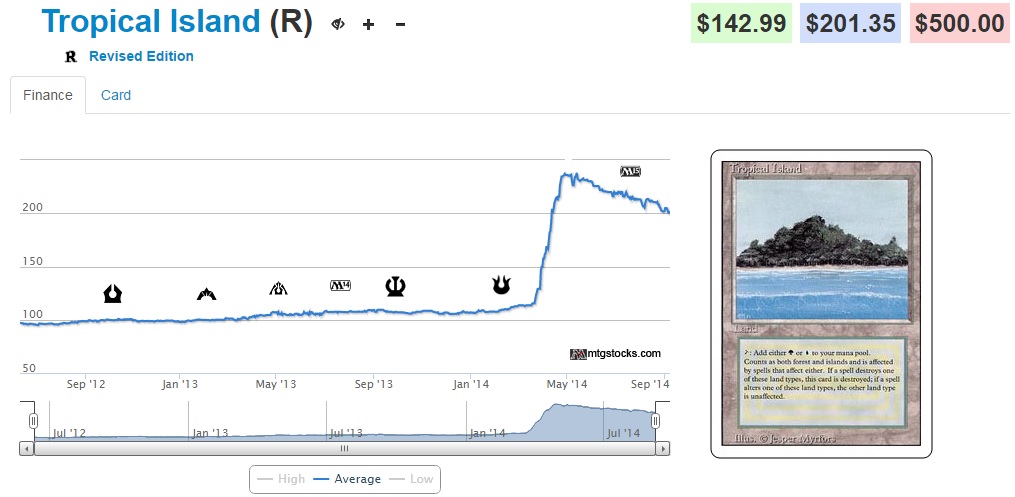 #5 Tropical Island (-3.13%) - The decline of Tropical Island seems a bit odd as BUG decks (both Shardless and Delver) have gained some popularity recently, however, there is clearly more in the supply (thanks to the March price bump) than there is in demand (as conveyed by that constant downward trend).