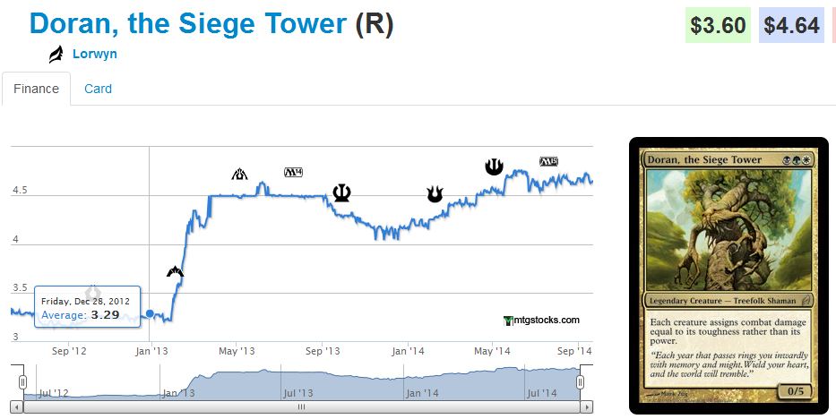 And let’s also not forget one of my favorite creatures that fits into a Khans shard: Doran, the Siege Tower, which has also been on an uptick lately.