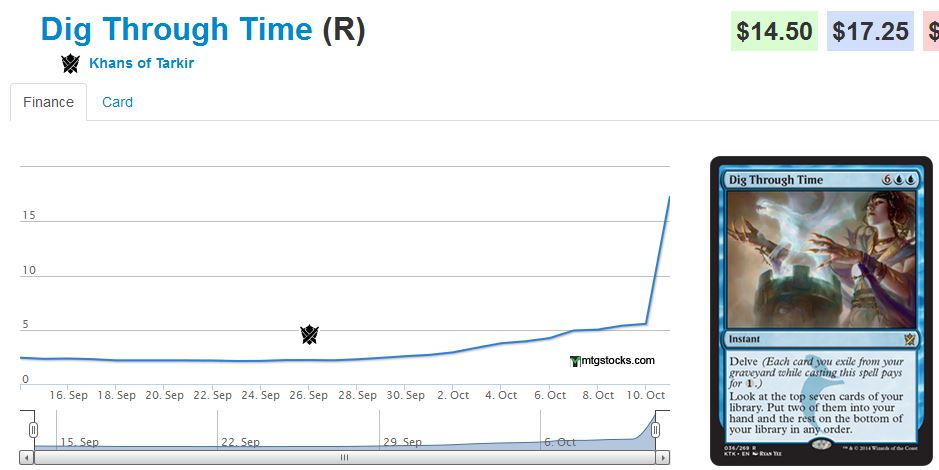 While $17.25 is awfully expensive for a large set rare, I certainly don’t think these will drop below $10 for quite some time. If you’ve got copies today, I’d try and unload them into this hype – either online or, preferably, in trades at your LGS. Capitalize on this hype. More and more copies of Dig Through Time will be opened and this card will inevitably drop in price. Don’t be left holding the bag. If you have copies you aren’t playing with, now is the time to move them and lock in profits.