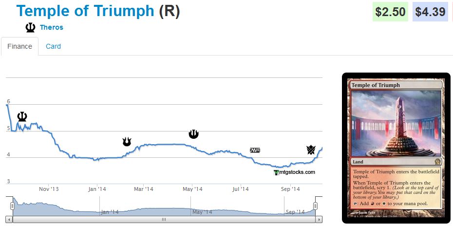 But if you look at the price chart of the R/W Temple, you can readily see how little this land has moved so far despite the strong showing. Now that people are focusing on Khans of Tarkir, Theros packs won’t be opened nearly as much, so the supply on this and other Temples will stagnate. Yet with Shock Lands gone from Standard, demand will only increase – especially for these top performers. If you can trade for them at $3-$4 and buy them for $3 or less, I don’t think you’d be disappointed.