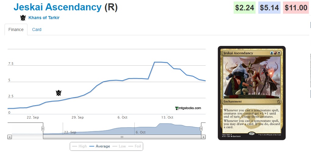 #3 Jeskai Ascendency (-35.7%) - This card saw a major drop after the Pro Tour (despite Channel Fireball playing the combo deck and a lot of people claiming how dominant it will be in Modern). I fear this is one of those cards that's so close to bannable that people are spooked and want to unload them ASAP--hence a big bump in supply pushing the price downward.