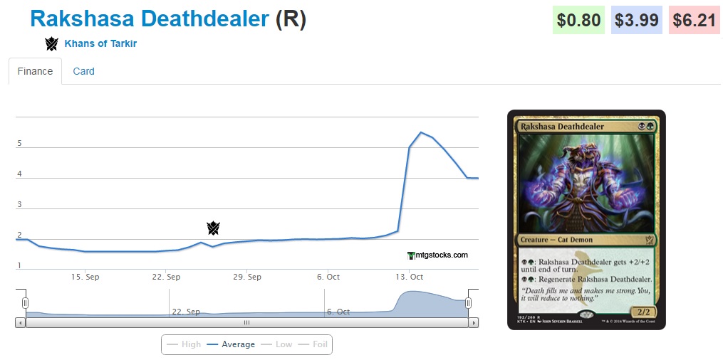 #2 Raksasha Deathdealer (+76.6%) - This one got a bump from seeing play at the Pro Tour (in the Abzan Aggro decks). He's proving to be a very difficult creature to remove and one of the few that can go toe-to-toe with Caryatid and Courser in the first few turns and come out on top.