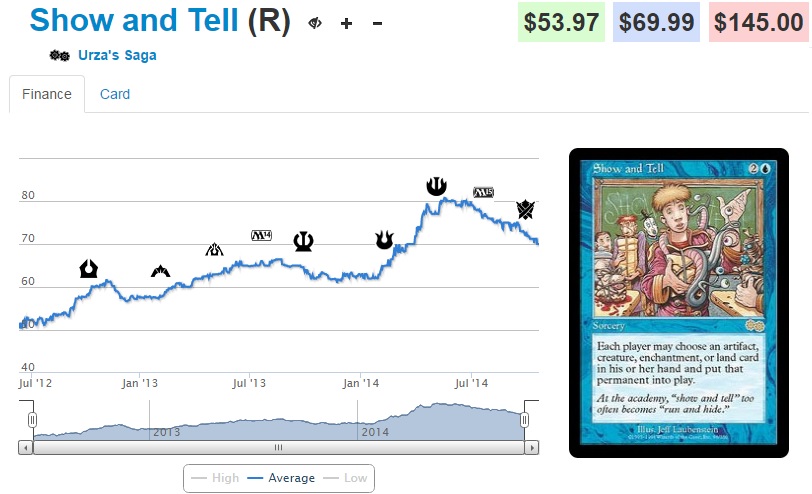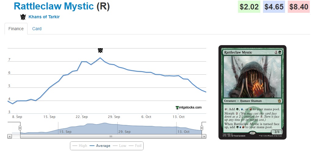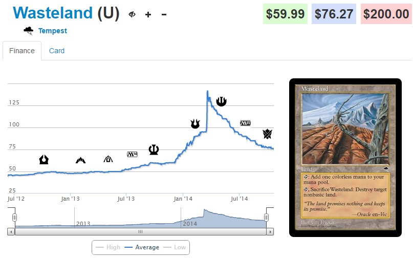 The biggest loser is Zendikar again. The massive influx of new Khans fetchlands has caused the original Zendikar fetches to drop to 50% or less of their yearly highs--and when you just want fetches, it makes a lot more sense to just buy the new Standard-legal set for one fourth the price.
