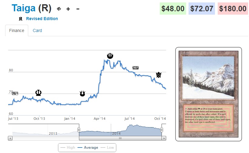 When the Legacy duals and other staples spiked in the Spring we thought it was a price correction. I think we are seeing that is true to some extent with the Blue duals it is not the case for Taiga and Wasteland and that price spike is evaporating slowly but surely. I don’t think your metagame analysis is helpful for the price of Taiga in particular, Zoo or Loam haven’t been major players and are not becoming major players. People get a deck together in Legacy and stick with it and don’t buy new cards and change decks week-by-week.
