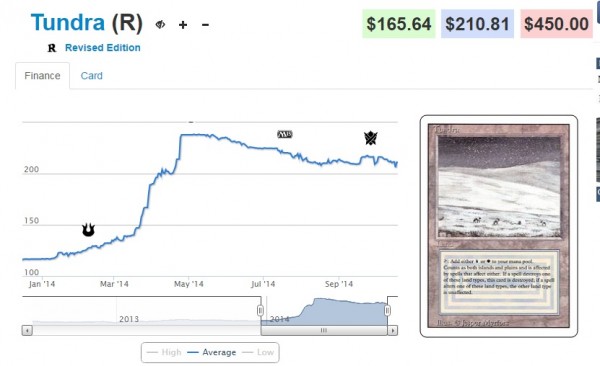 #3 Tundra (-1.80%) - Good ol' Reliable Tundra is sadly continuing it's slide downward. While Miracles continues to see a decent amount of play (and Esper Deathblade pops up here and there), the UWR Stoneblade decks of a few months ago are nowhere to be seen (and these decks were a major reason Tundra saw continued demand).