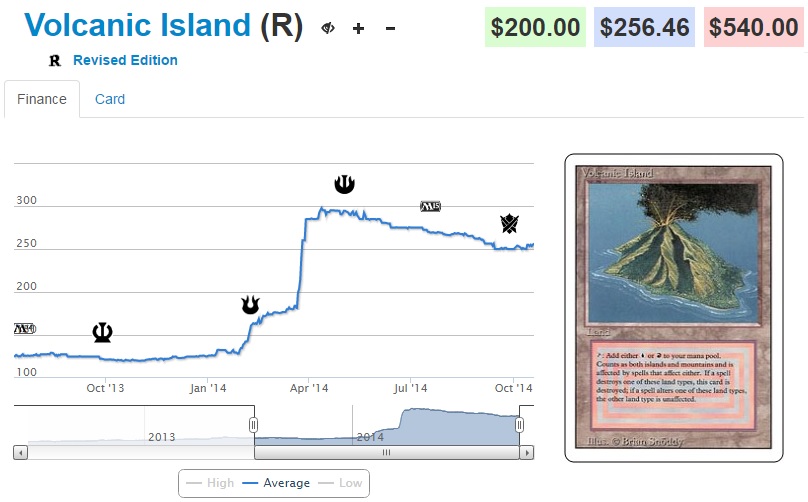 #2 Volcanic Island (+1.84%) - The only card in our blue chips that's positive this week. Volcanic Island has seen an increase in demand courtesy of the bump in U/R Delver and Burn decks taking advantage of the ridiculousness that is Treasure Cruise. Finally, the decks that only need to cast seven spells have a way to gain actual card advantage and they can use a resource they previously had little access to (save the versions running Snapcasters).
