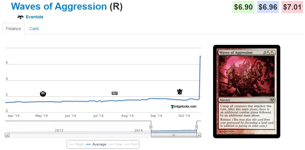 #1 Waves of Aggression (+316.8%) - This one smells of buyout (as of this writing 9:05 PM 10/19/14 EST) there are only three copies left on TCG player. However, just because it's a buyout doesn't mean it's not a solid pick. This is an amazing card in the Narset EDH decks that are proving themselves very powerful.