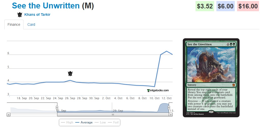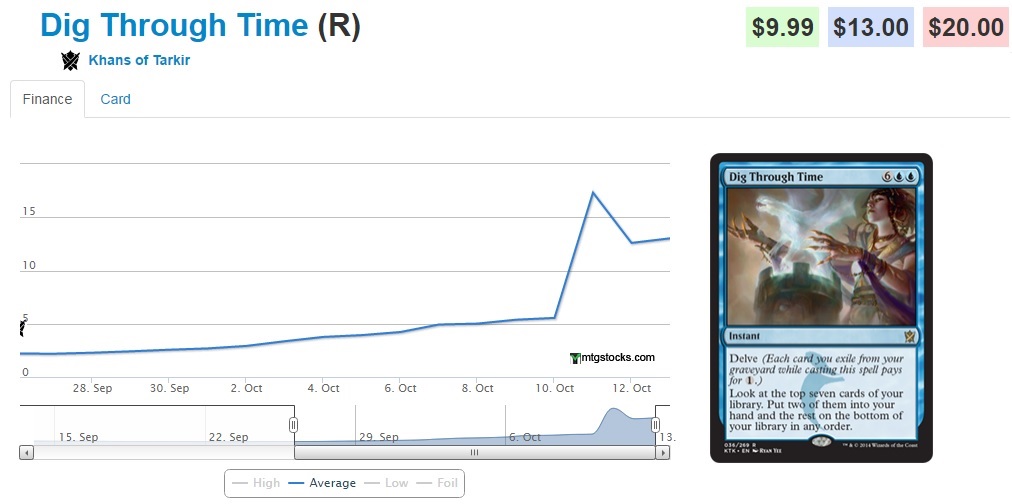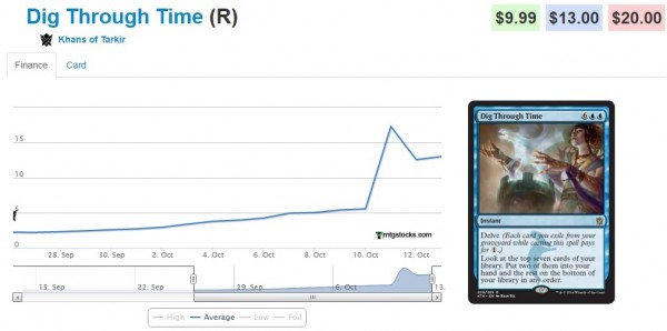 Dig Through Time was a $2-card that jumped to $13 (we're going to ignore the one-night $17 spike). This was actually a pretty easy call given we saw the Jeskai Burn decks do so well the week before at the SCG Open and this card does seem like an obvious natural fit.