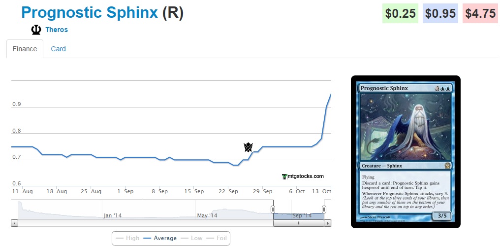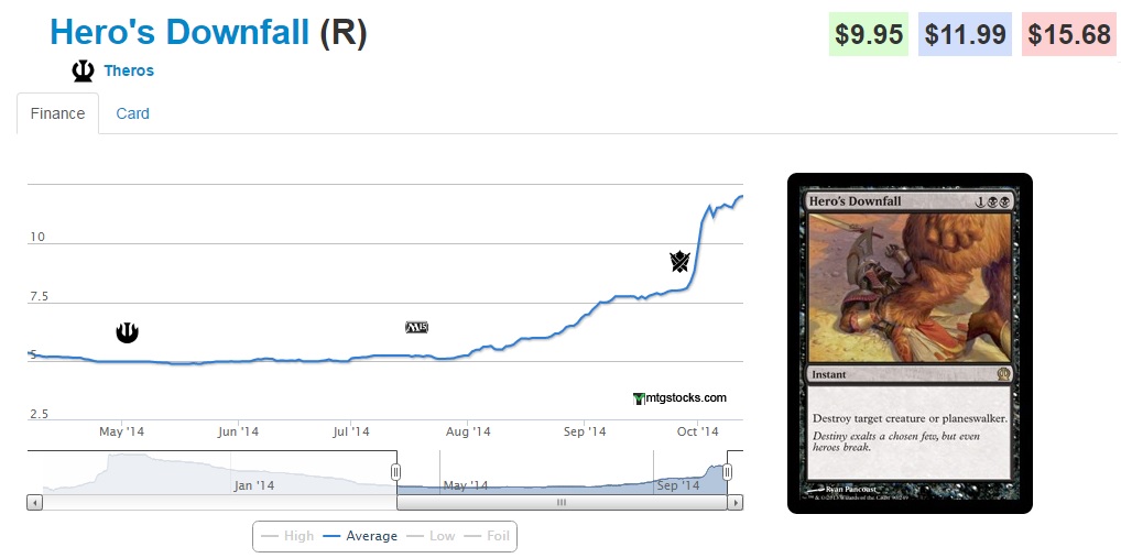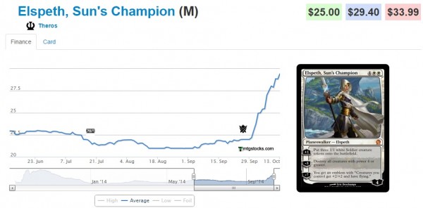 This card actually showed up nine times in the Top 8 decklists (five of which were in sideboards), but he was one of the stars of the block format. While he didn't jump a whole lot, so much Theros was opened that a card would have to be a major breakout star to see a big jump. However, you can clearly see a small spike thanks to so many copies in the Top 8.