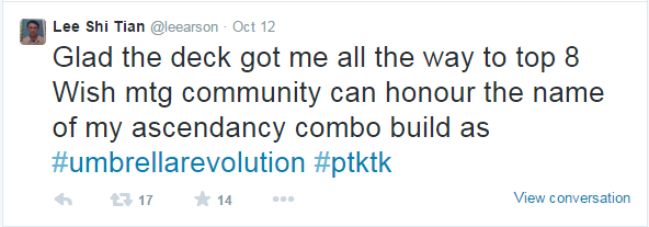 Why is Li Shi Tian special? Basically, he didn't have much time to practice for the Pro Tour because he was engaged in "The Umbrella Revolution"