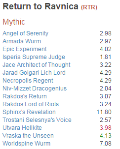 So time is running short for large-scale redeemers, which moves prices upward on the rarest cards. Check out the prices for Return to Ravnica mythics as of this week: