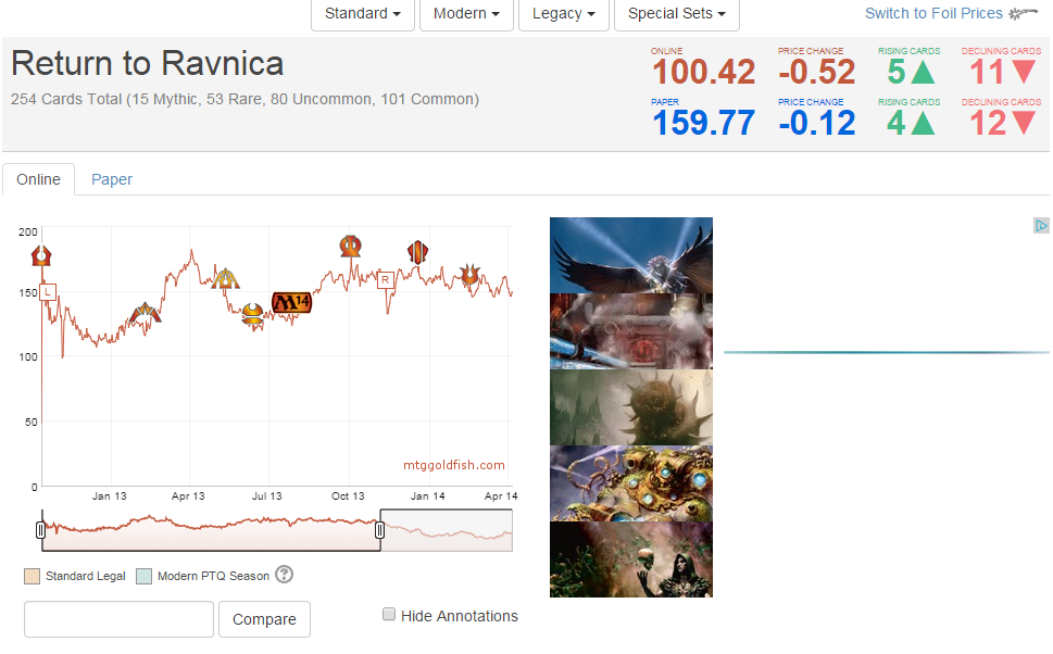 Don't sell your mythic rares for less than a dollar. That's an adage I've lived by, and it's worked out quite well. When I sold my Return to Ravnica cards to draft Theros, I held onto all the mythics that were selling for less than a dollar or two. Because redemption has a cutoff date, mythics are often in demand right before then. In Return to Ravnica's case, guaranteed redemption goes through October 31 of this year. WOTC will honor redemptions made for the next year, but only if there is still stock.