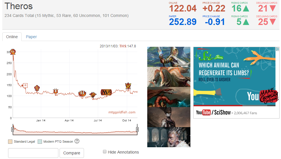 This is why you hold your cards for a year. Theros was highest at its release, but its next highest point was right during the Khans release events: